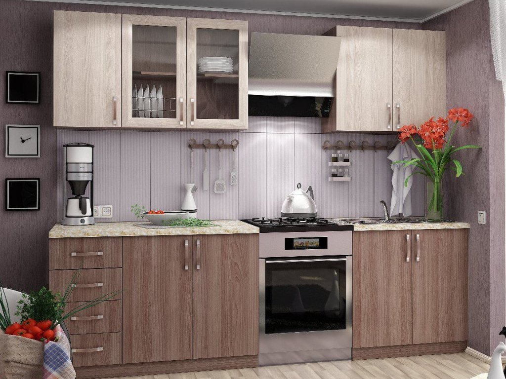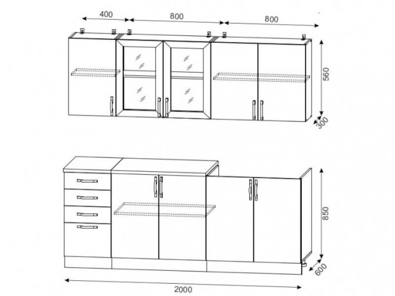 Кухня Татьяна - современная и стильная кухня для небольших квартир. Кухонный гарнитур имеет максимально низкую цену, благодаря небольшим размерам и простому, но в то же время красивому дизайну. В данной кухне есть все необходимое: шкаф-витрина, шкафы с глухими дверями, стол с ящиками и 2 стола с 2-мя дверями для различной кухонной утвари и сыпучих продуктов.